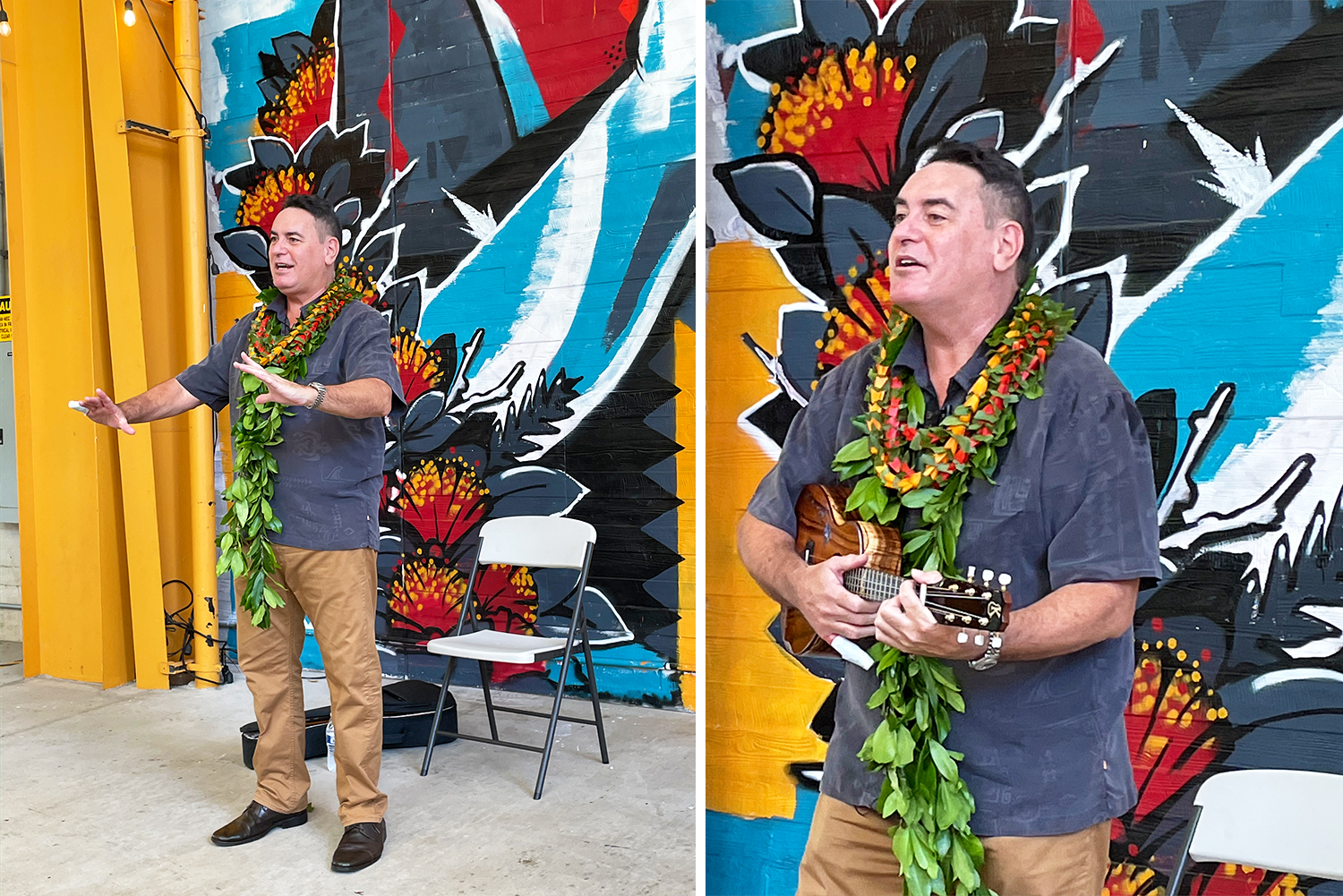 With Kaka‘ako’s origins established, Manu transitioned to the next segment with a few verses of the mele (song) “Henehene Kou ‘Aka” while strumming his ‘ukulele. Kaka‘ako is mentioned as a destination for pipi (beef) stew in the cheerful melody.