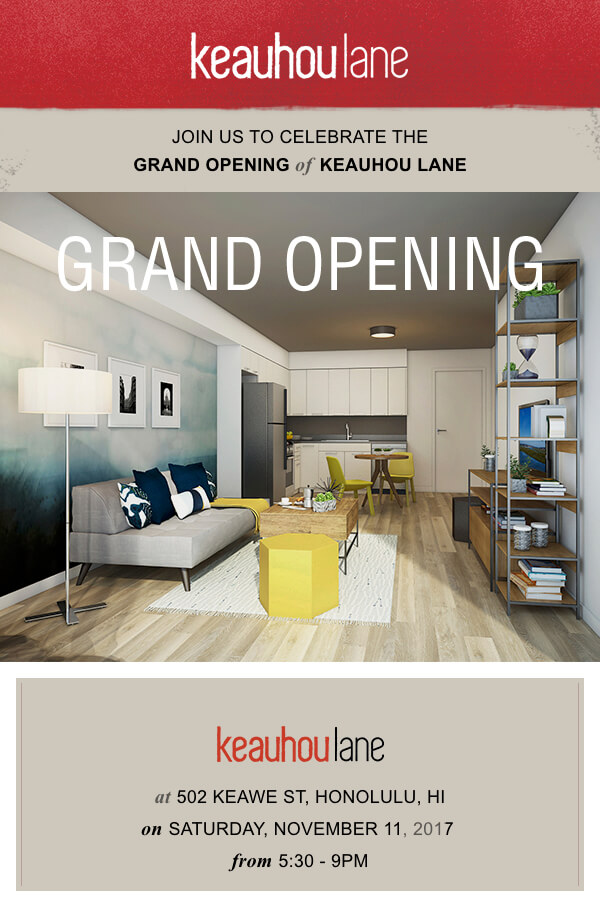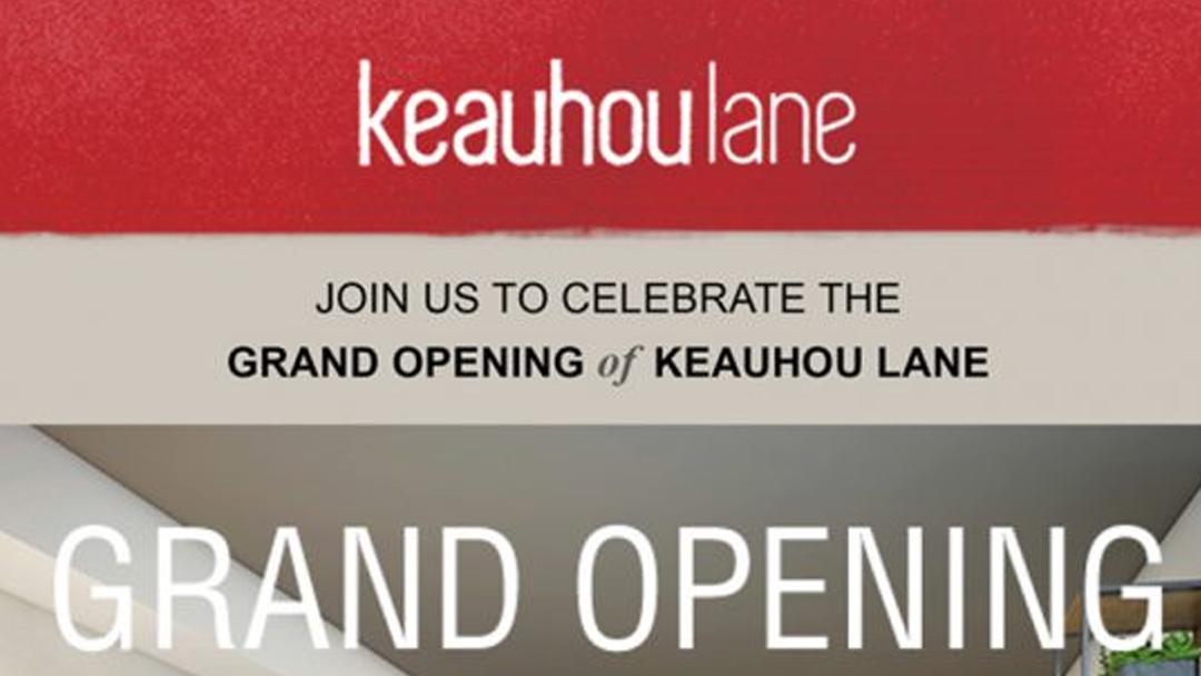 Celebrate the grand opening of Keauhou Lane this Saturday from 5:30 – 9 pm! Sample free bites and beverages from REAL a Gastropub, Ya-Ya’s, Down to Earth, Hibachi and Tea Time. Listen to live music and take a tour the model units.