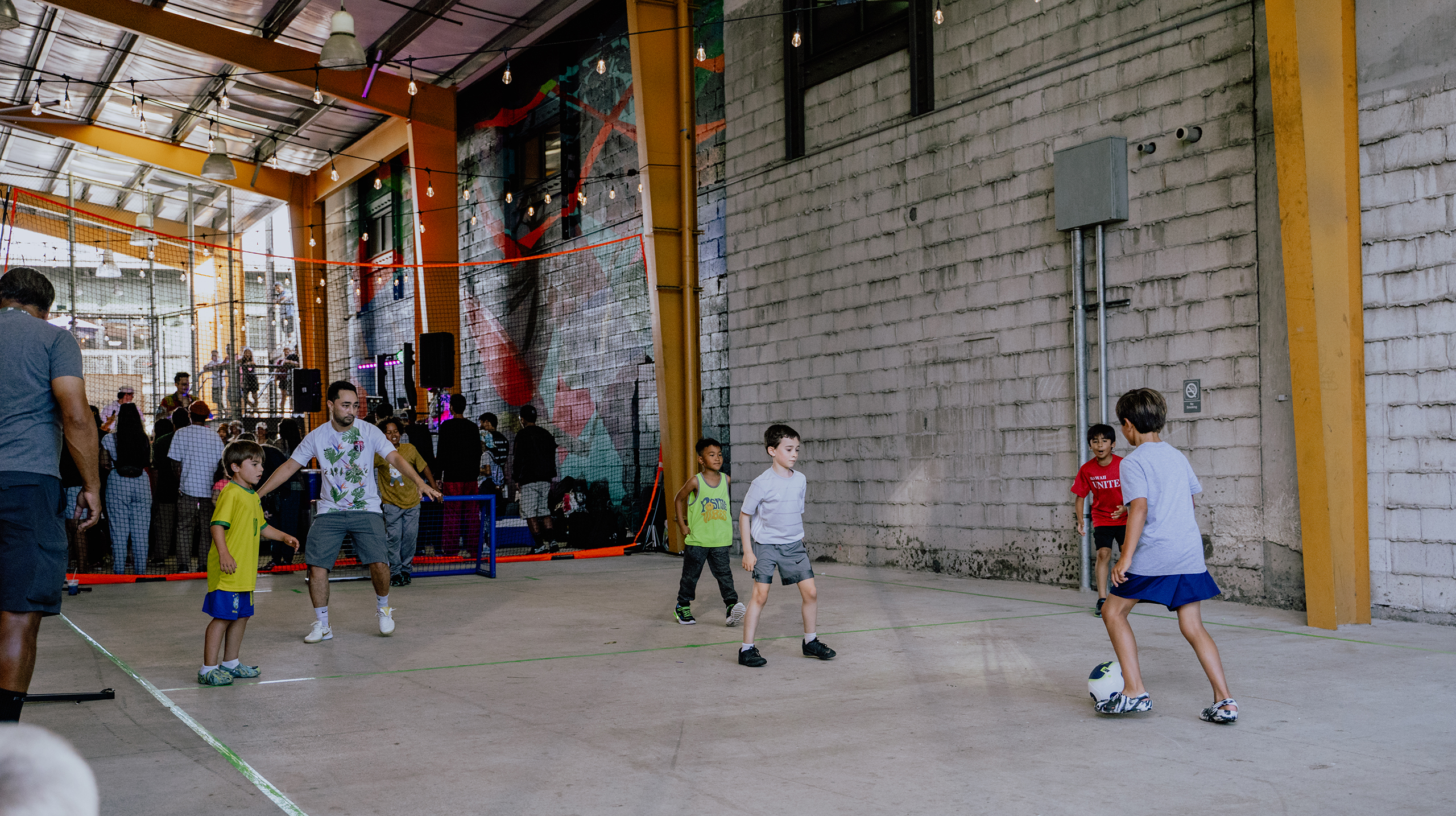 Paradise Soccer Club hung nets, laid down field lines, and set up goals in The Barn at SALT at Our Kaka‘ako to host indoor soccer games, including a keiki clinic in the first hour.