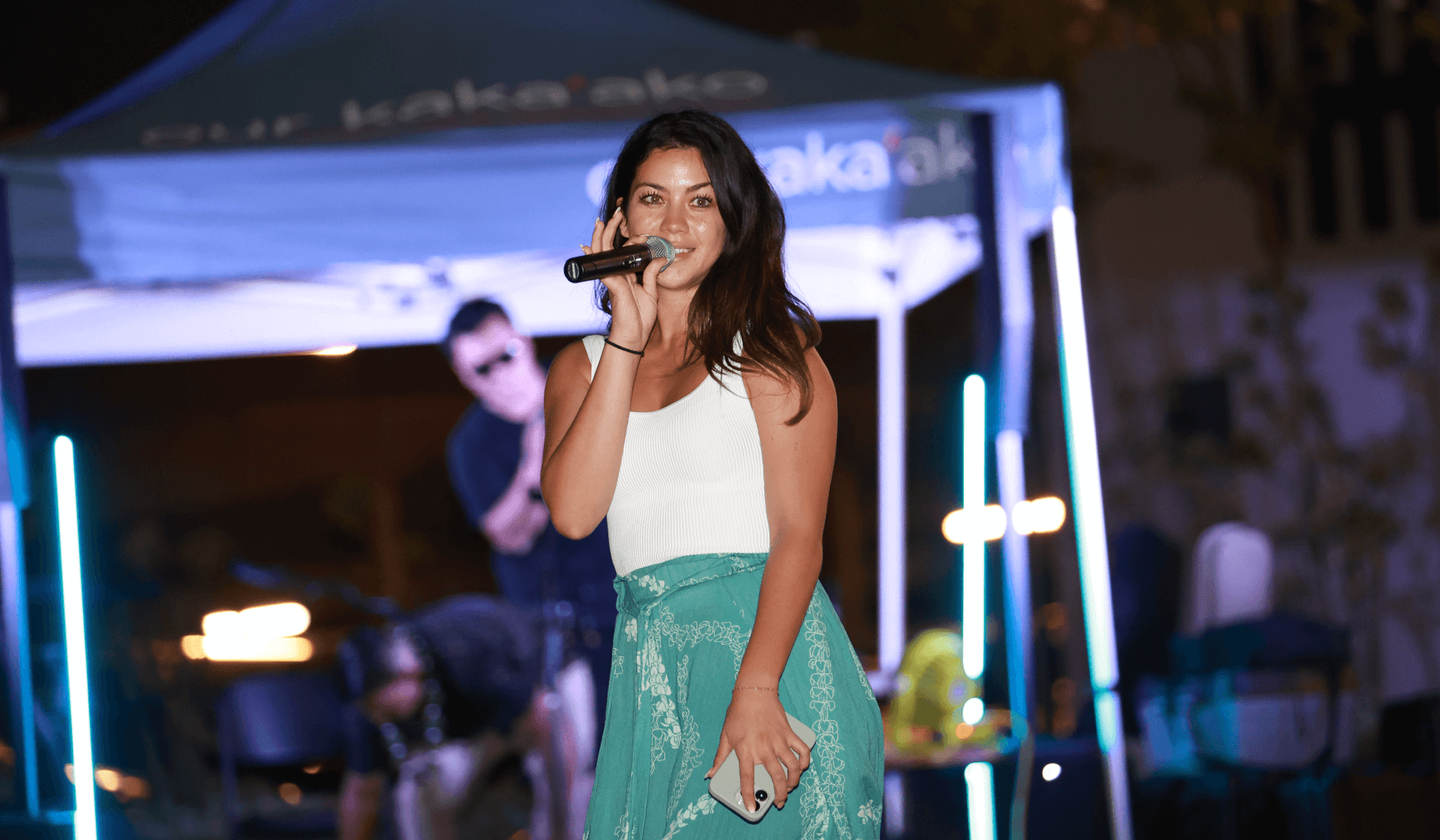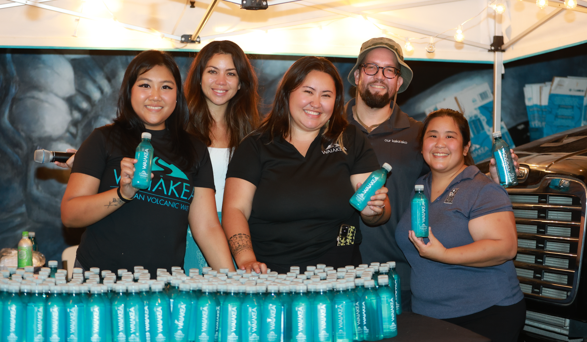 The Waiākea Stage at Kaloko‘eli Courtyard – Professional softball star, gold medalist, and Kamehameha Schools alumna Kama Dung partnered with Hilo’s Waiākea Hawaiian Volcanic Water’s Kōkua Initiative to host a food and donation drive in support of the Hawai‘i Foodbank at the Kaloko’eli Courtyard. They were joined by Dillon Pakele & Friends, who performed at the Waiākea Stage while Kama led giveaways throughout the evening, including a skanking contest, where possibly the first ever backwards skank was performed!