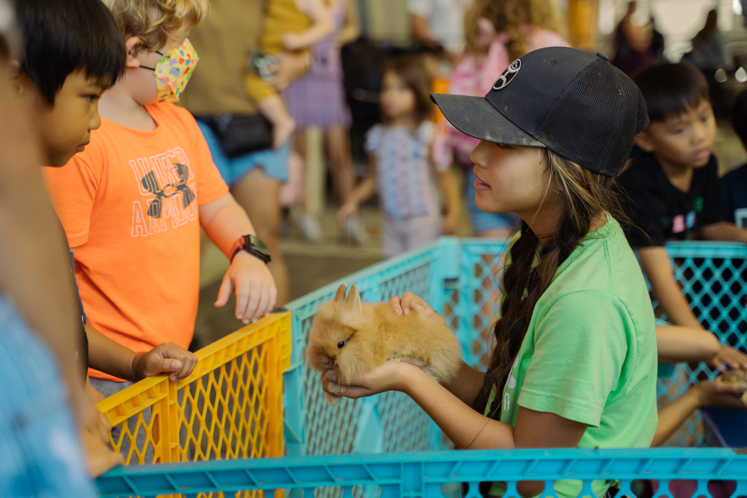 In the Barn at SALT at Our Kaka‘ako, our Kula (Fields) and Kai (Sea) Zones delighted the keiki with coloring pages, arts and crafts, and a tactile sand pit. Peering around the folks gathered in one corner, we saw the animals in the petting zoo receive plenty of pats and praise.