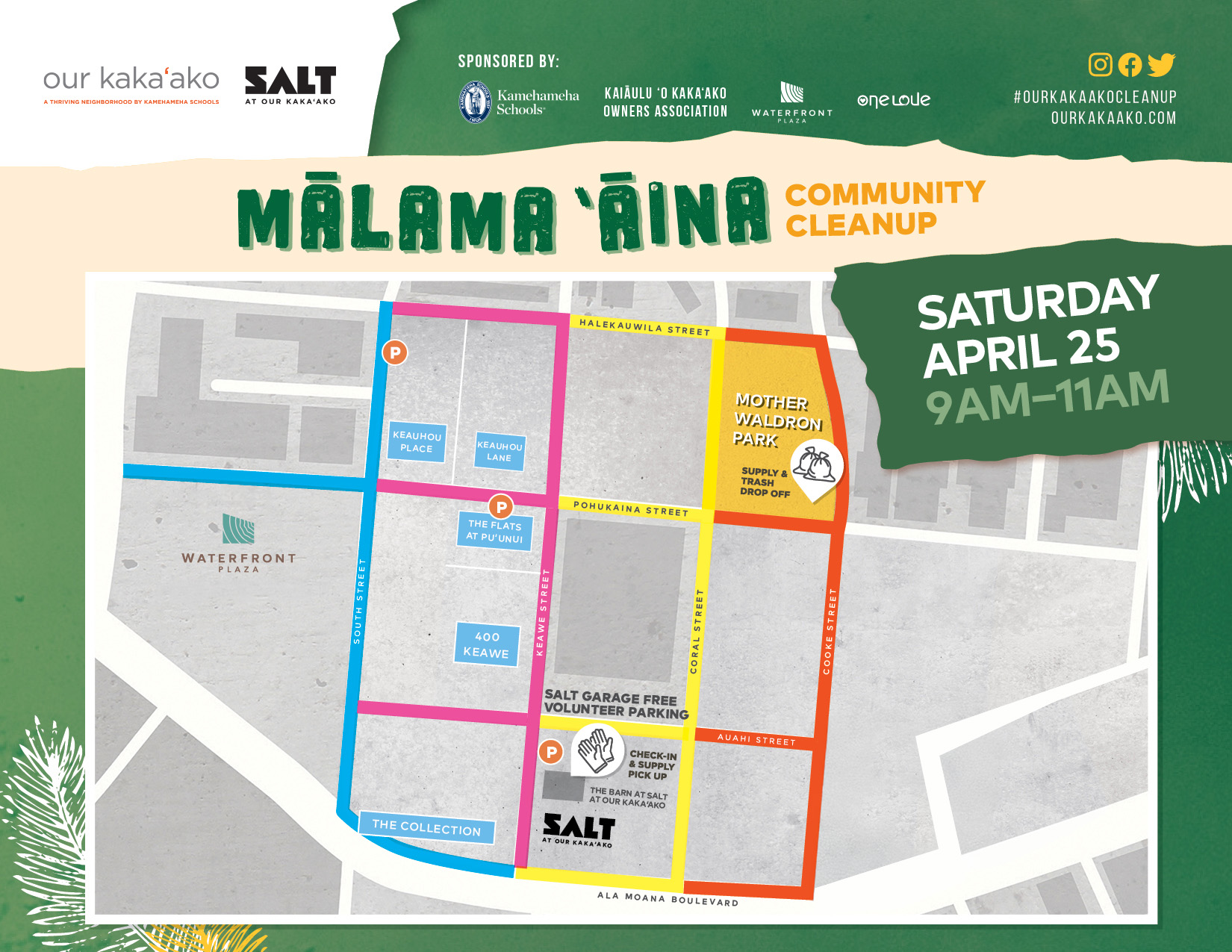 - Check-in will take place at The Barn at SALT at Our Kakaʻako. Volunteers will receive group assignments, supplies, and instructions. Refreshments will be available (while supplies last).