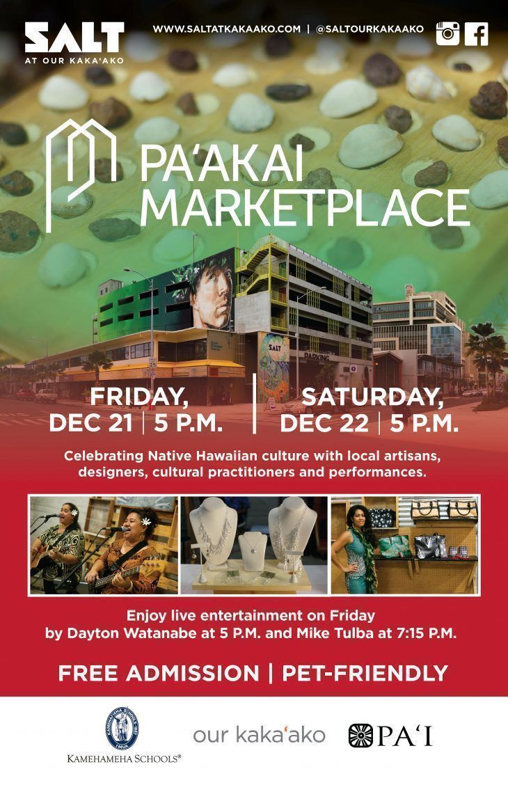 SALT at Our Kakaʻako’s monthly Pa‘akai Marketplace celebrates local merchants and artists on Friday, December 21 and Saturday, December 22nd. The cultural showcase brings together Hawaiʻi artists, crafters and cultural practitioners. Held in collaboration with PAʻI Foundation, it is a free family and pet-friendly event.