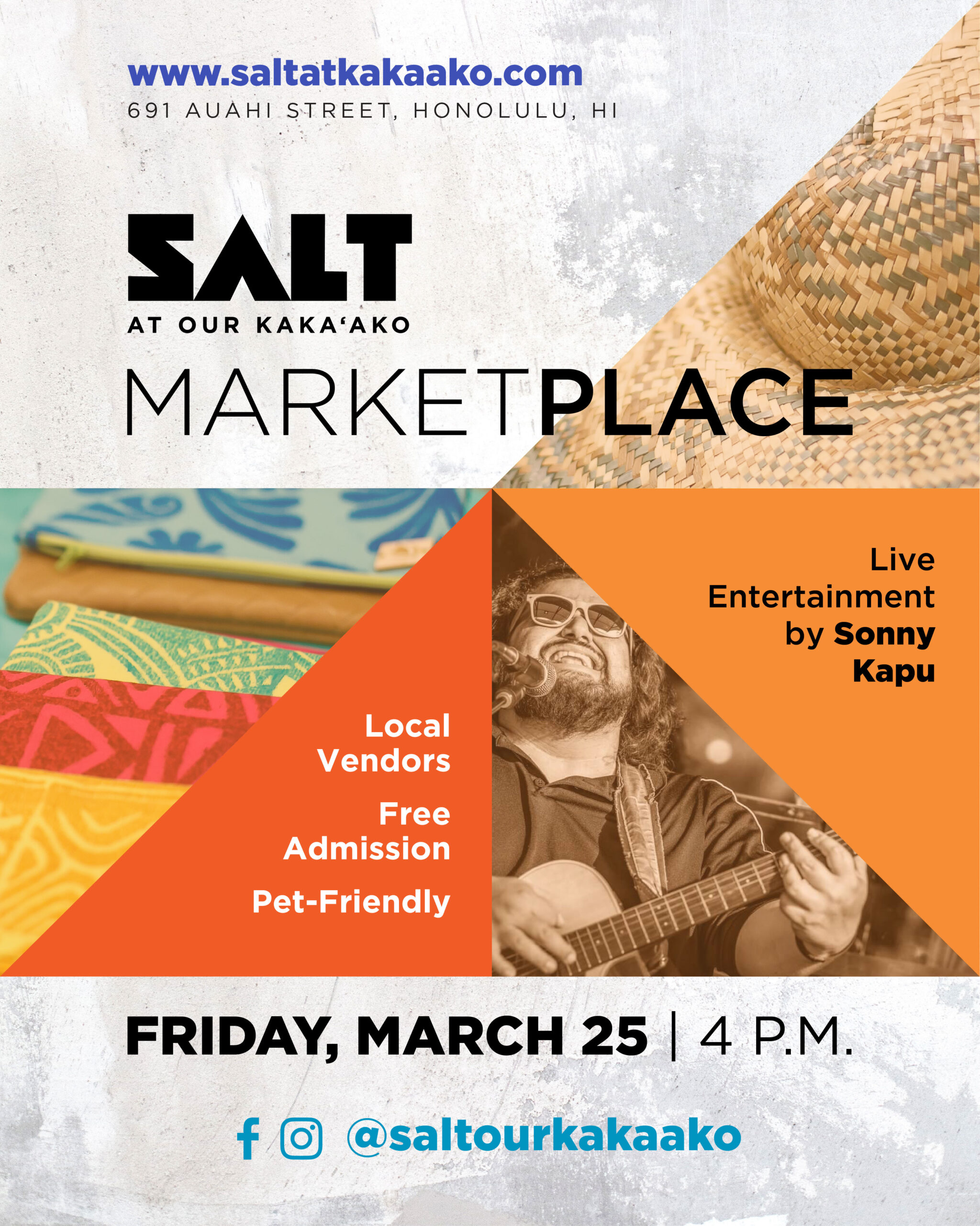 Enjoy live music by Sonny Kapu and shop local vendors at the SALT at Our Kaka‘ako Marketplace on Friday, March 25, at 4:00 p.m.! Bring your fur friends and family for a fun evening with us. See you there!