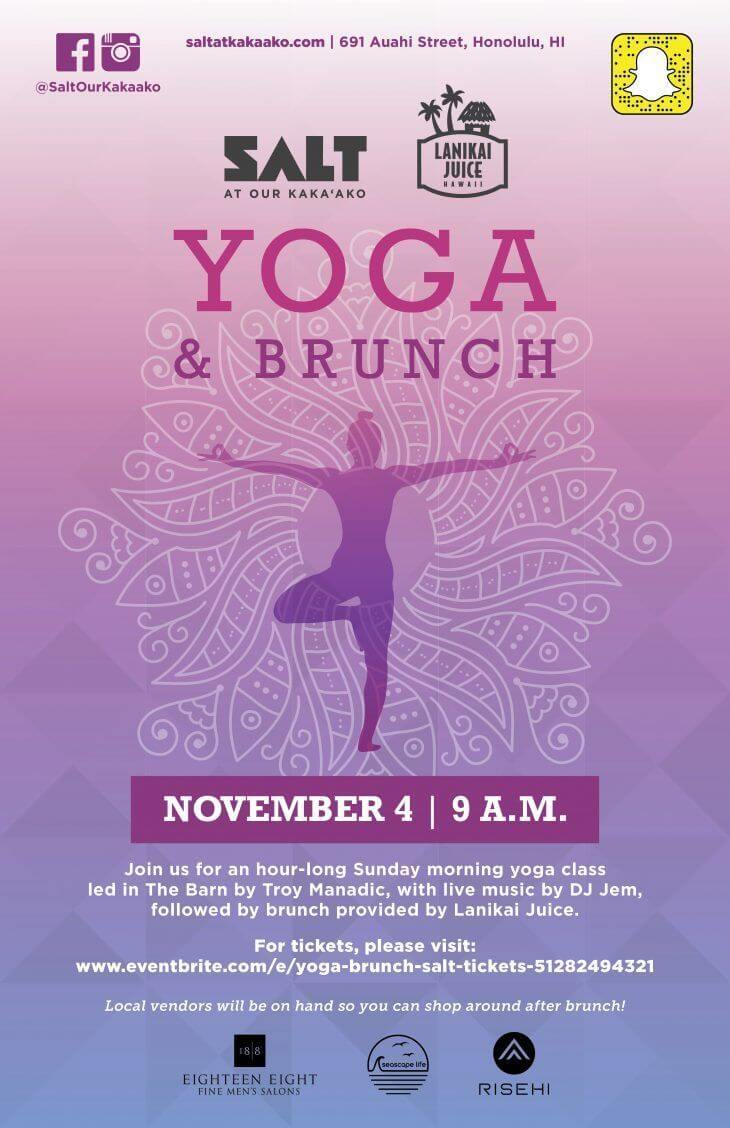 Join us for an hour-long Sunday morning yoga class led in The Barn at SALT by Troy Manadic with music by DJ Jem, followed by brunch provided by Lanikai Juice. Local vendors will be on hand so you can shop around after brunch! For tickets, please visit: www.eventbrite.com/e/yoga-brunch-salt-tickets-51282494321